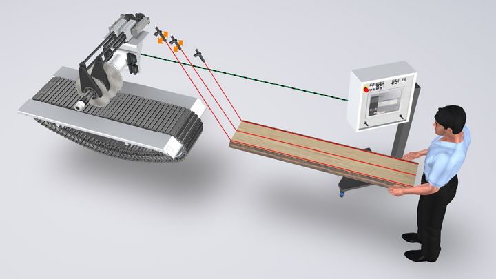 RipAssist calcule automatiquement la meilleure répartition de la planche et positionne les lames mobiles en conséquence. Au moyen des lignes tracées par le laser sur la planche, l'opérateur contrôle ainsi le résultat et peut procéder si nécessaire à des corrections à l'aide du joystick ou de l'écran tactile.